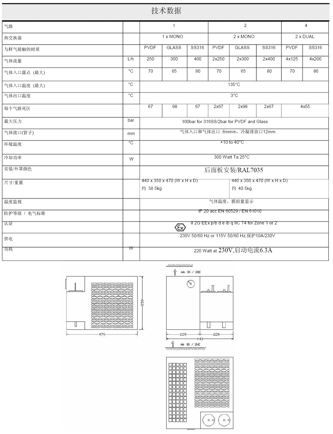 緊湊型和免維護防爆型冷凝器JCT-EX主要部件是高性能的熱交換器和精制的壓縮機,用以調節冷卻系統。唯一的壓力和溫度控制電源調節、較高的應用以及較好的部件,都有利于長時間穩定露點。熱交換器靈活的結構,允許高流量和保證樣氣和冷凝物適當分離。JCT EX防爆型冷凝器提供穩定可靠的技術,耐腐蝕。可用于危險區域如1區 或 2 區,通過ATEX認證。